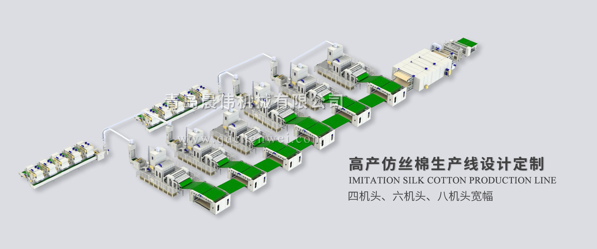 青島晨偉機械有限公司 專業(yè)設(shè)計定制各類無紡布單機設(shè)備及生產(chǎn)線。 我公司主要產(chǎn)品:電子秤重開包機、開松機、給棉機、氣壓棉箱、(高速)單錫林雙道夫梳理機、(高速)雙錫林雙道夫梳理機、鋪網(wǎng)機、中速針刺機、高速針刺機、烘箱/烘房、燙光機、熱軋機、收卷切片機,無紡布設(shè)備、仿絲棉設(shè)備、防塵布設(shè)備、噴膠棉設(shè)備、無膠棉設(shè)備、硬質(zhì)棉設(shè)備、土工布設(shè)備生產(chǎn)線、椰棕床墊生產(chǎn)線、大棚保溫被生產(chǎn)線、蠶絲被生產(chǎn)線、床上用品設(shè)備等各種無紡布機械設(shè)備。